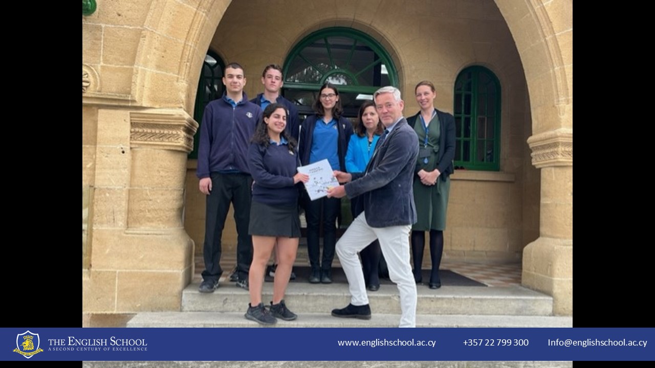 To mark their first official duty, Headmaster David Lambon presented the student leaders with a copy of the commemorative brochure from the exhibition. The student leaders are Head Boy Philemon Antoniou, Head Girl Marisa Troullidou, Deputy Head Boy Georgios Tornaritis, and Deputy Head Girl Louissa Maroudia.