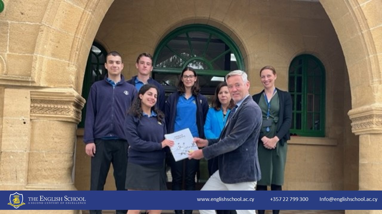 To mark their first official duty, Headmaster David Lambon presented the student leaders with a copy of the commemorative brochure from the exhibition. The student leaders are Head Boy Philemon Antoniou, Head Girl Marisa Troullidou, Deputy Head Boy Georgios Tornaritis, and Deputy Head Girl Louissa Maroudia.