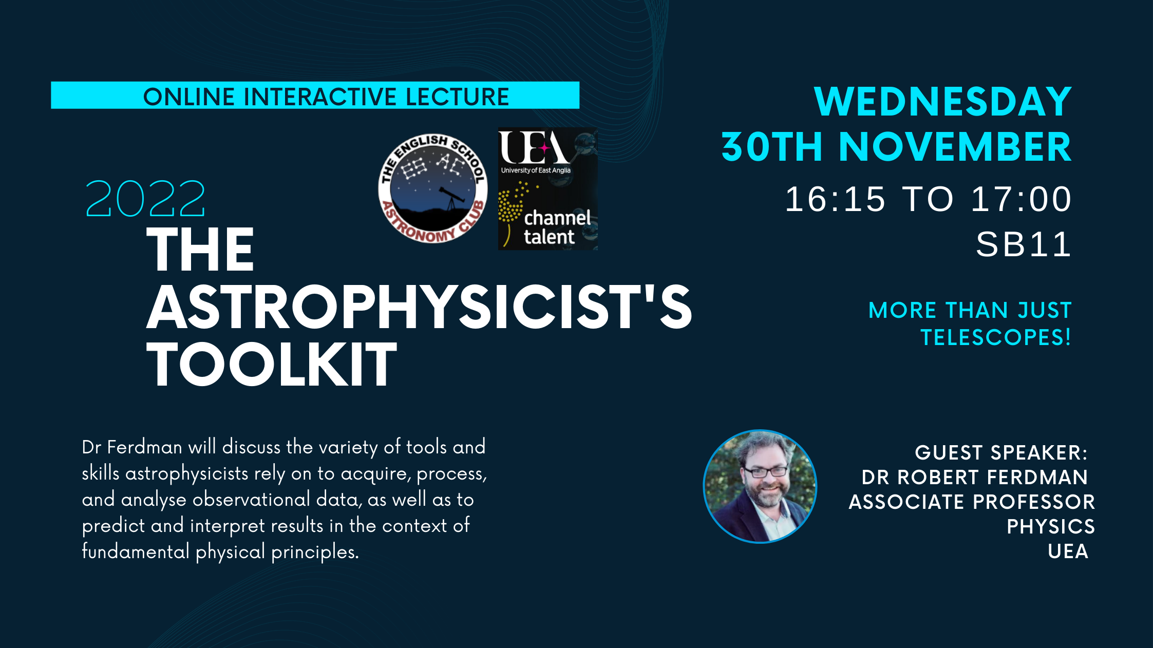 Dr Robert will discuss the variety of tools, and skills astrophysicists rely on to acquire, process, and analyse observational data, as well as to predict and interpret results in the context of fundamental physical principles. As well as modern telescopes and the physics applied, Robert will take a look at the computational tools required for rapid calculations to tackle massive volumes of data and large-scale theoretical simulations.